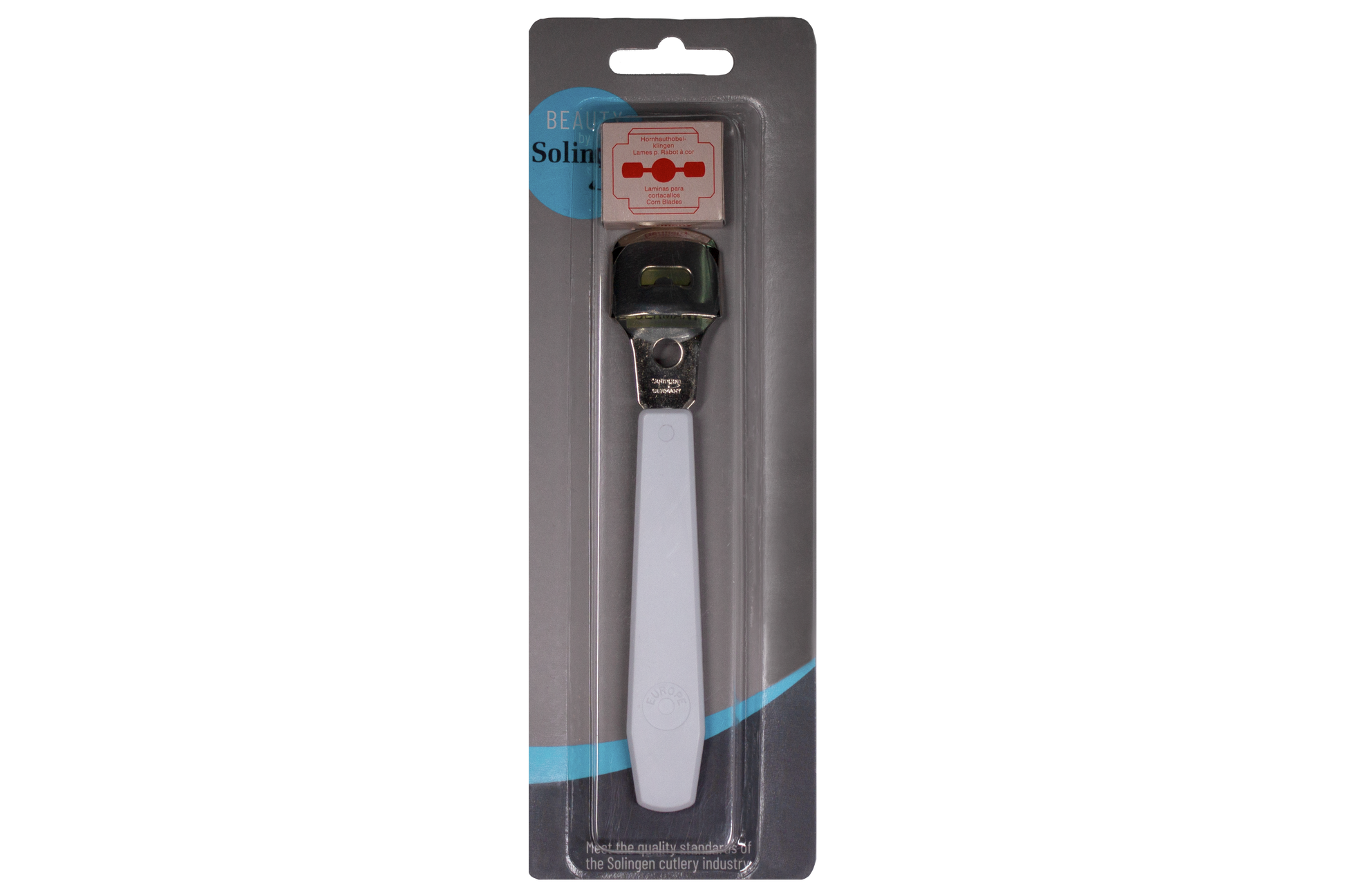 De eeltschaaf (incl. doosje met 10 reserve mesjes) is een onmisbaar hulpmiddel in de pedicureverzorging. Deze is gemaakt in Duitsland en vervaardigd van hoogwaardige materialen, zorgt dit product voor nauwkeurige en comfortabele verzorging. Voor gebruik het te verwijderen eelt voorweken met warm water tot het zachter is. Plaats een nieuw mesje indien nodig en reinig de schaaf na gebruik. Voor het eerste gebruik de beschermsticker verwijderen en de schaaf reinigen. Tip: Gebruik een 'Beauty by Solinger' Puimsteenblokje om het geheel glad af te werken.