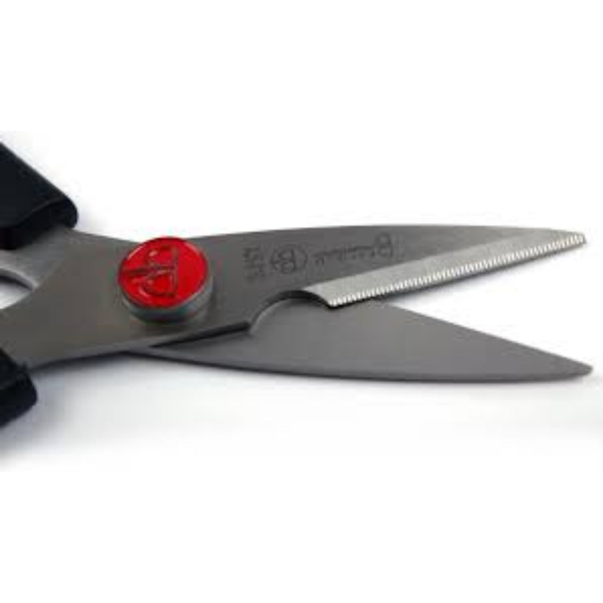 Multi functionele roestvrijstalen BEXFIELD by SOLINGER uitneembare keukenschaar met microvertanding van 20,5cm met zwart kunststof greep met als extra een draaidop opener, kroonkurk-opener, kabel/touw/bot knipper en multifunctioneel lipje voor blikjes e.d.